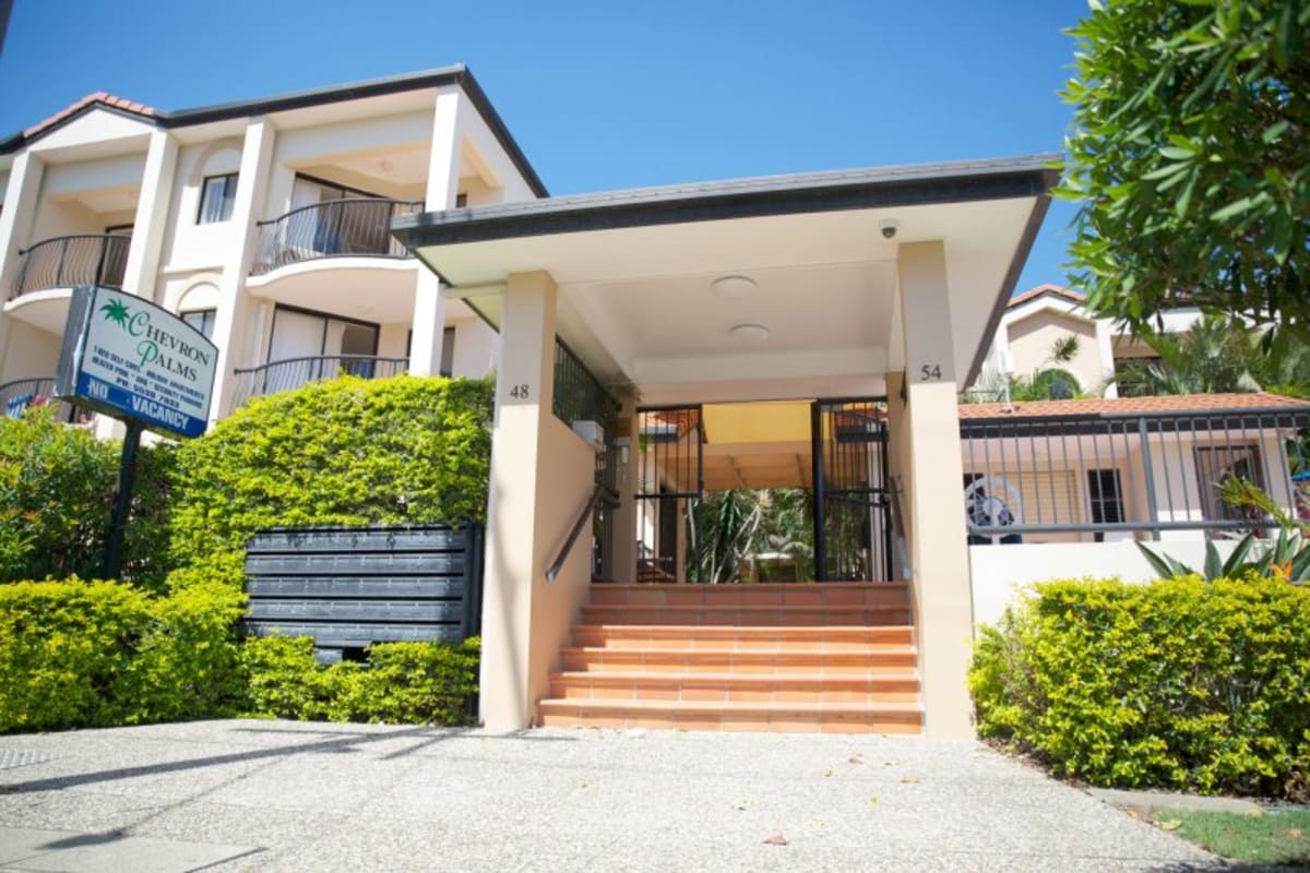 Chevron Palms is a 3 storey, Mediterranean style complex featuring 1 bedroom apartments just 500 metres from Surfers Paradise in this prime location on Chevron Island. The apartments are tastefully decorated and fully self contained and include a spacious open living area and a sunny balcony or patio. Just a short stroll from the beach and endless dining and entertainment options of Surfers Paradise. The resort facilities include a heated outdoor swimming pool and a BBQ. Chevron Palms offer a great Surfers Paradise getaway for the price conscious traveller looking for great amenities and a prime location.